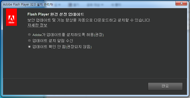 위의 방법으로 Windows 7 설치 환경을 구성하셨다면 절대로 업데이트를 하여서는 안됩니다. 최신버전으로 업데이트하게 될 경우 Adobe Flash Player의 구버전 설치가 막히게 됩니다.