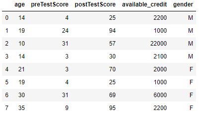 위 데이터를 보았을 때 [age, perTestScore, postTestScore, available_credit] 4개의 변수는 수치형 변수이고 [gender] 1개의 변수는 카테고리형 변수임을 알 수 있습니다. 즉 이를 벡터로 나타내면 다음과 같습니다.
