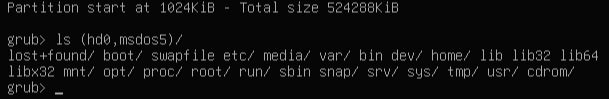 위의 경우 hd0에는 (hd0,msdos5) 파티션과 (hd0,msdos1) 파티션이 존재함을 확인할 수 있습니다. ISO 파일이 어떤 파티션에 있는지 확인하기 위해 다음과 같은 명령어를 입력하면 해당 파티션의 파일 구조를 확인할 수 있습니다.