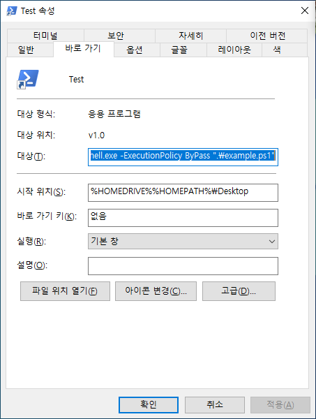 다음으로 PowerShell의 바로가기를 수정하여 스크립트가 바로 실행될 수 있도록 설정해줍니다. 해당 바로가기의 속성에서 다음과 같이 수정해줍니다.