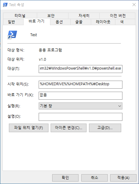 속성에서 '바로 가기' 탭을 선택해 시작 위치(S)에 PowerShell이 시작되었을 때 위치를 설정해줍니다. 위와 같이 설정하실 경우 PowerShell이 실행되자마자 바탕화면에서 PowerShell이 시작됩니다.