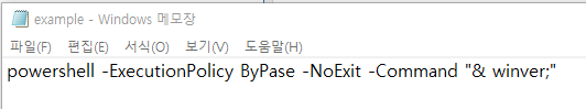 지금부터 PowerShell 명령어를 바로 실행할 수 있는 스크립트를 만들어보도록 하겠습니다. PowerShell이 실행되는 스크립드를 메모장으로 다음과 같이 작성하였습니다.