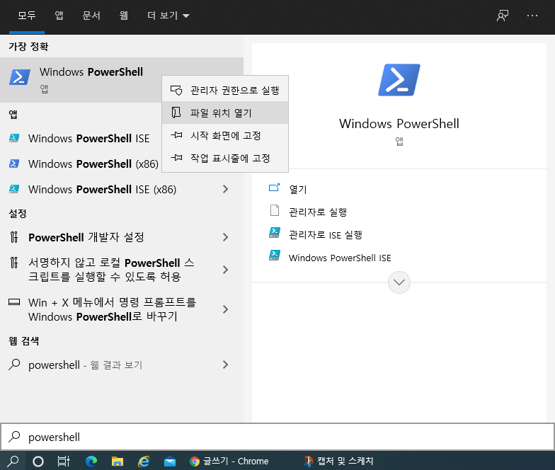 시작버튼 오른쪽에 위치한 돋보기 버튼을 클릭하여 'powershell'이라고 검색하면 아래와 같은 화면을 보실 수 있습니다.