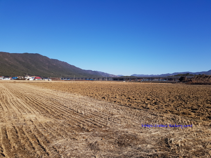 철길에 접근해보니 한적한 논밭 중간을 열차가 휘감으며 달리는 구간이었습니다.