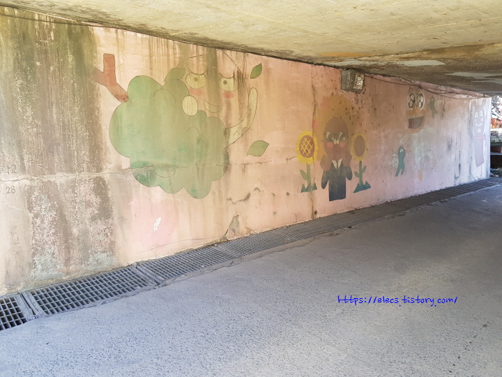 굴다리 및 벽은 카카오 프랜즈 캐릭터들이 그려져 있습니다.