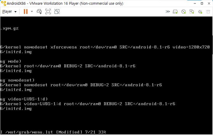 이번 포스팅에서는 고정되어 있는 안드로이도 x86의 해상도를 설정하는 방법에 대해 설명 드리고자 합니다. 해상도 변경을 위해서 grub 부팅 과정에 미리 해상도를 설정해주는 방법을 사용합니다.