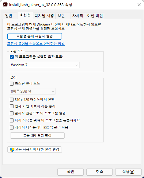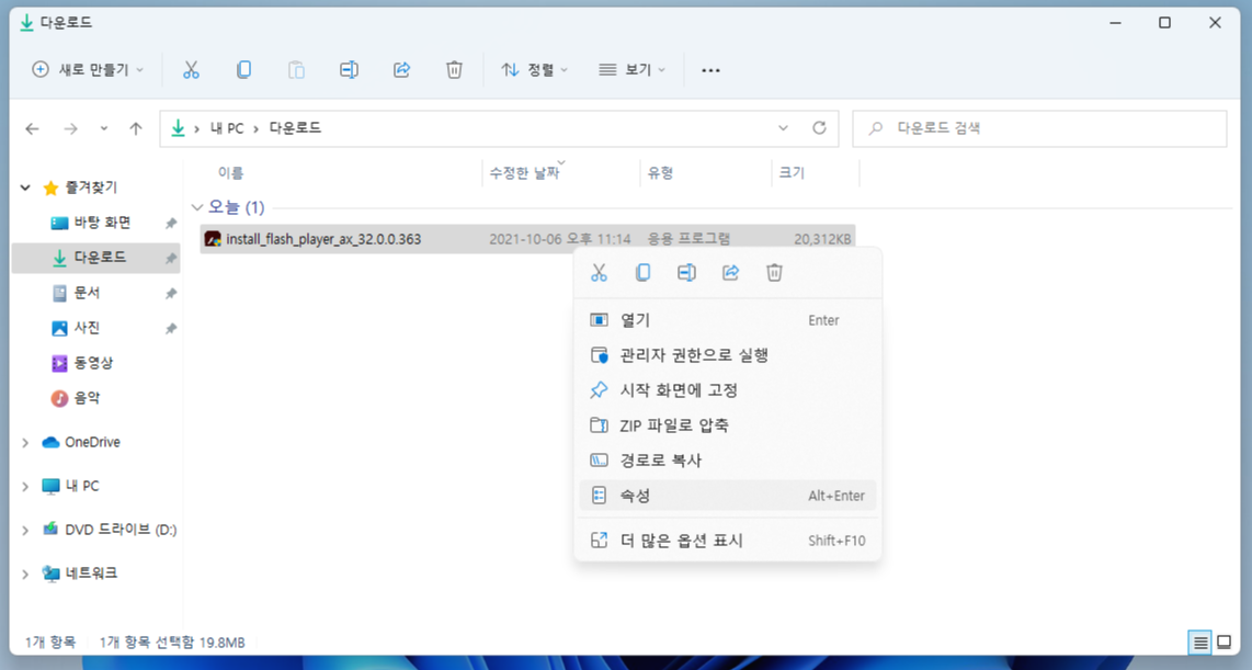 2. 다운로드 받으신 플래시 플레이어 설치파일을 오른쪽 클릭한 다음 속성을 클릭합니다.