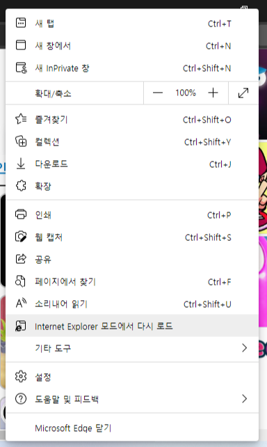 9. 다시 브라우저를 실행한 다음 메뉴를 열고 'Internet Explorer 모드에서 다시 로드' 버튼을 클릭합니다.