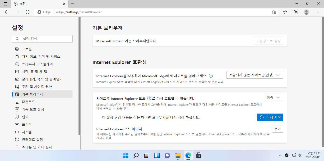 8. '기본 브라우저' 탭에서 '사이트를 Internet Explorer 모드로 다시 로드할 수 있습니다.'를 허용으로 설정 후 '다시 시작' 버튼을 클릭합니다.
