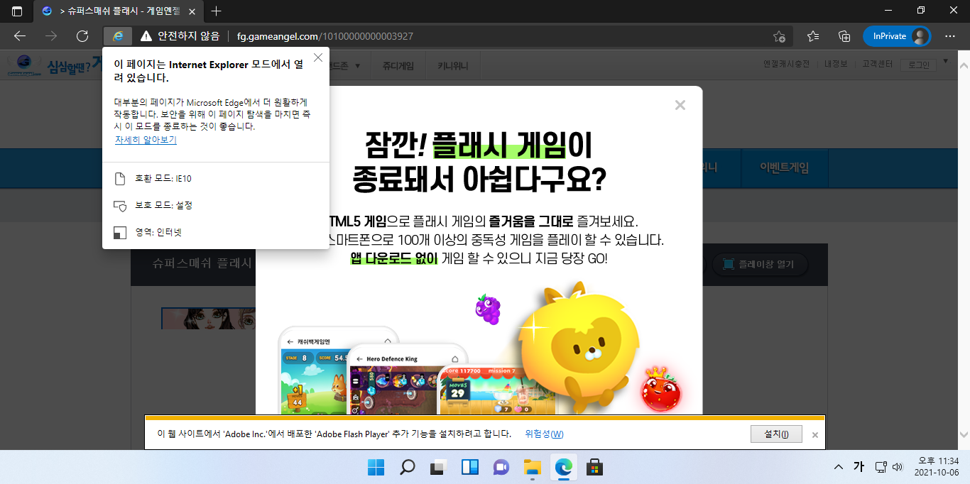 Interent Explorer 모드를 실행하면 Edge에서도 플래시가 실행되고 있는 것을 보실 수 있습니다!