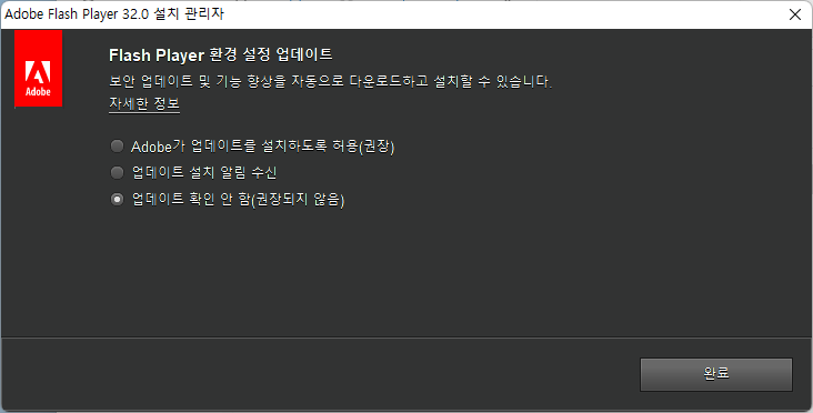 6. 설치가 완료되면 '업데이트 확인 안 함(권장하지 않음)'을 선택하신 후 '완료' 버튼을 눌러주세요.