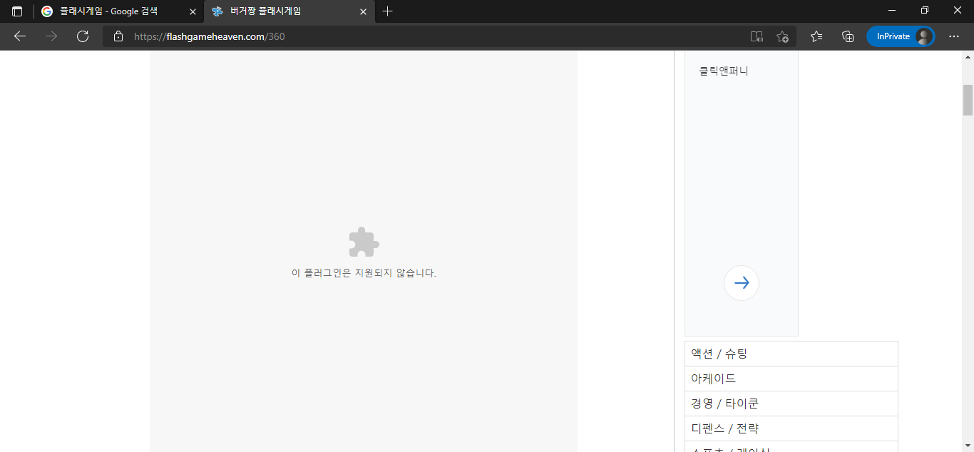 아무런 설정 없이 플래시가 지원되는 웹사이트 접속시 '이 플러그인은 지원되지 않습니다.'라는 안내만 나옵니다만