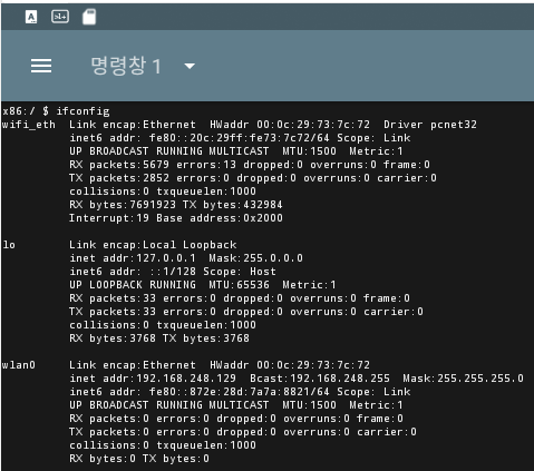 안드로이드 x86의 터미널을 실행하신 후 ifconfig를 입력하여 ip주소를 확인합니다.