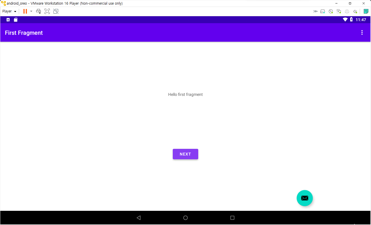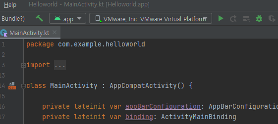 위의 과정에서 안드로이드 기기와 연결된 것을 확인하셨다면 Android Studio에서도 아래와 같이 VMware가 연결되었음을 확인하실 수 있습니다. 아래의 초록색 화살표 버튼을 눌러 에뮬레이터에 앱을 설치해봅니다.