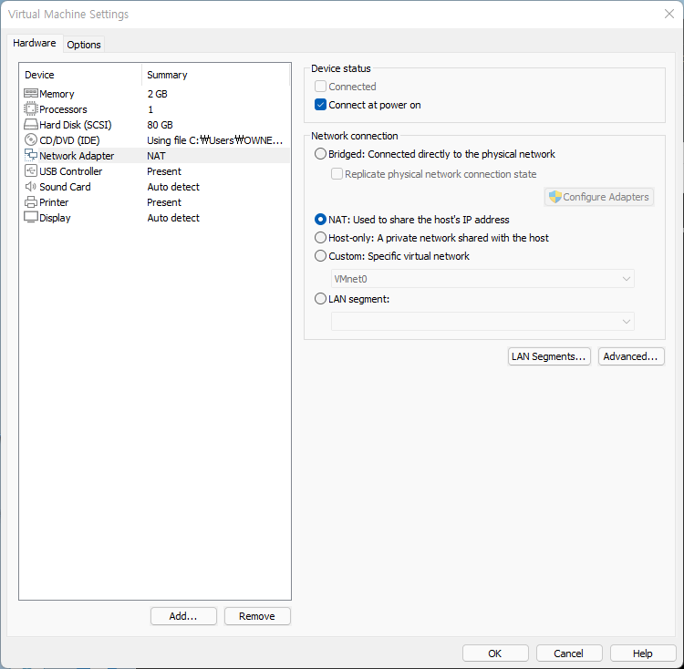 먼저 VMware의 환경설정에서 Network Adapter를 NAT로 설정해주세요.