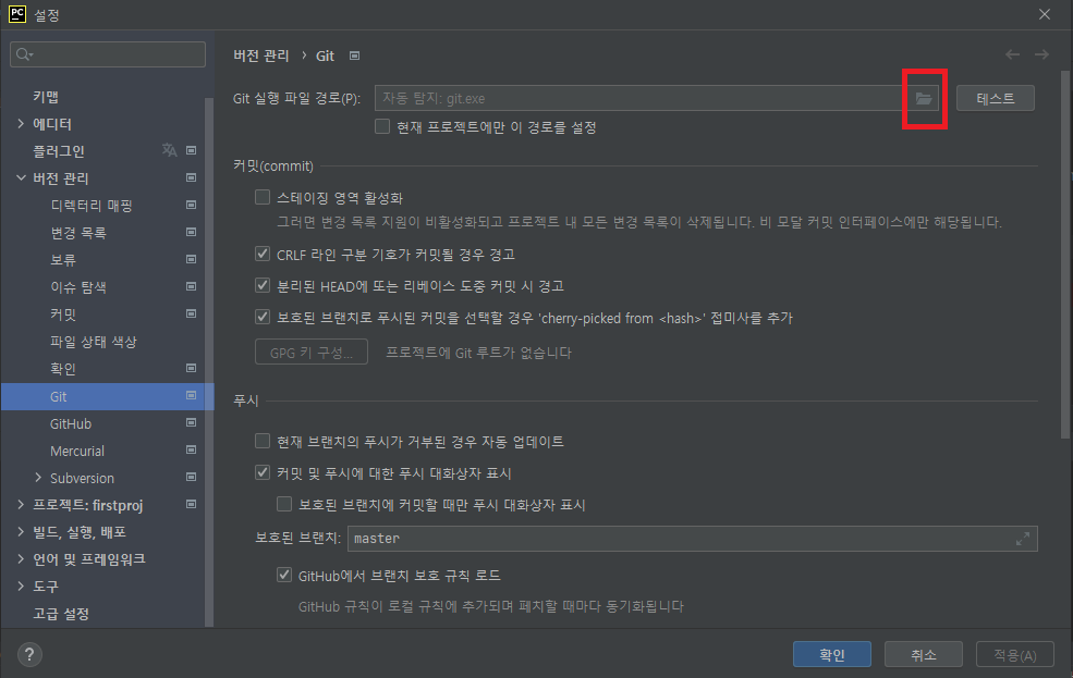 먼저 해당 프로젝트를 연 다음 Ctrl+Alt+S 버튼울 눌러 Setting(설정)창을 여신 다음 버전 관리(Version Control) → Git 메뉴에서 아래와 같이 Git 실행 파일 경로룰 빨간색으로 표시한 부분을 클릭함으로서 설정하실 수 있습니다.