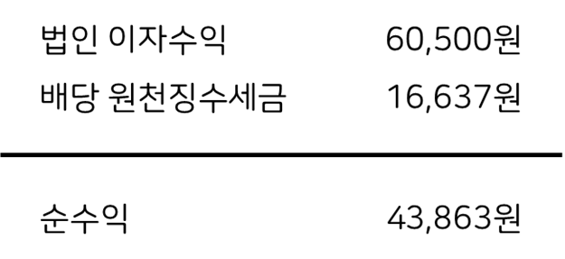 물론 법인으로부터 개인이 수익을 가져오기 위해서는 급여로 지급받거나 주식 배당금으로서 비로소 수익 실현을 할 수 있습니다. 아래의 경우 위의 과정을 통해 얻은 이자수익을 배당으로 개인이 가져가게 될 경우 원천징수 세금 27.5%가 적용되어 순수익은 아래와 같습니다.
