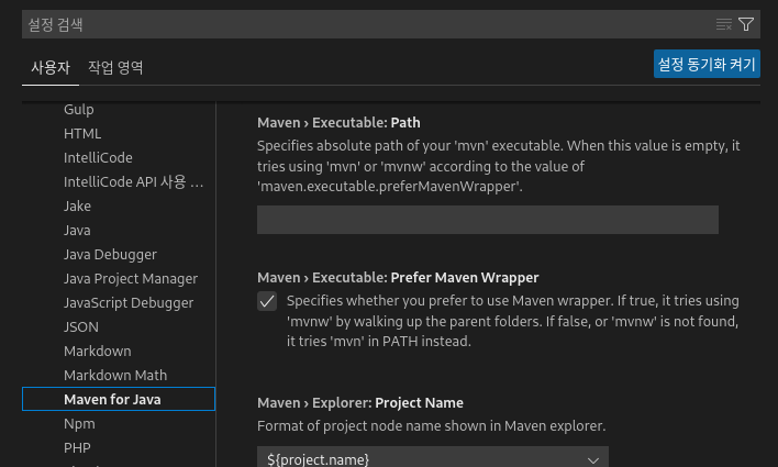 다음으로 설정 탭에서 Maven for Java 탭을 선택한 후 Maven > Executable: Path 메뉴에서 설치된 maven의 bin 경로를 입력해줍니다.