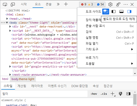 아래와 같은 설정 창이 나타나면 점 세개(…) 버튼을 클릭하신 다음 도크 사이드(별도의 창으로 도킹 해제)를 설정하여 넓은 화면으로 설정창을 변경해줍니다.