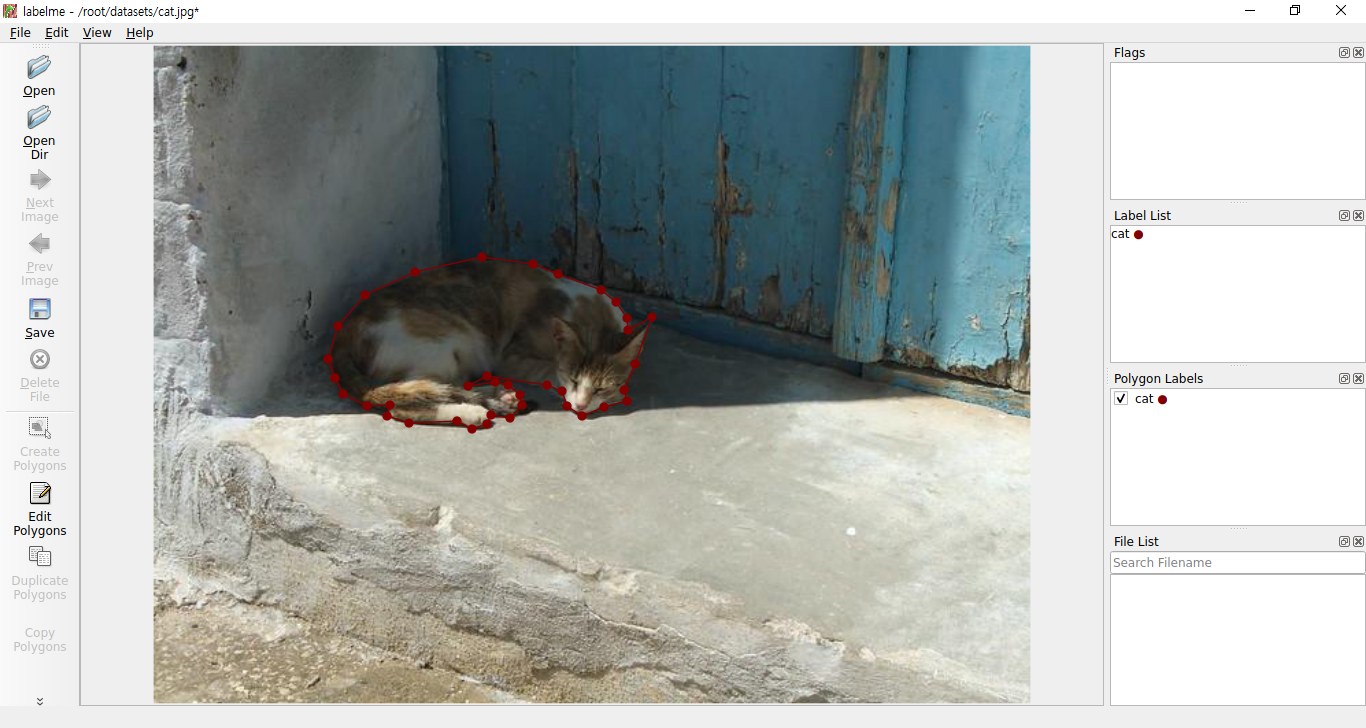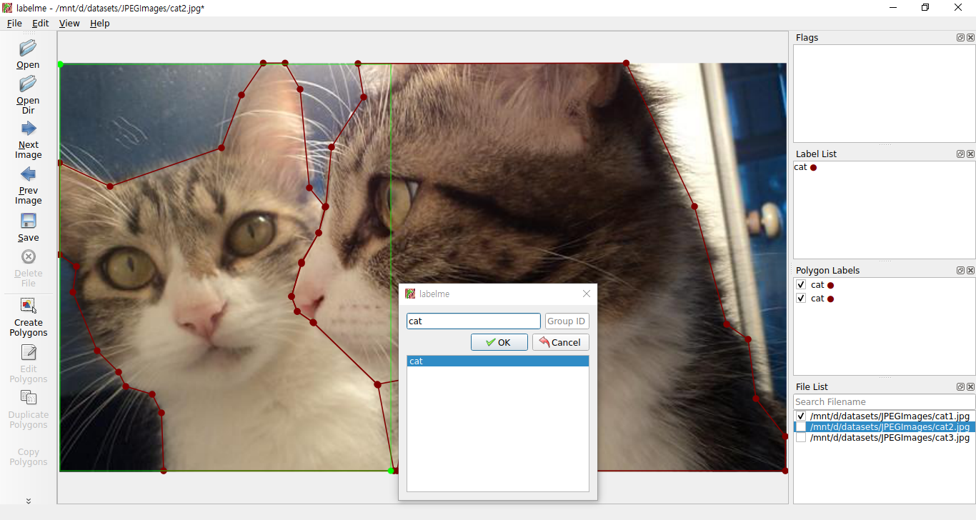레이블링을 수행하고자 하는 이미지를 불러온 다음 마우스 오른쪽 버튼을 클릭하여 'Create Polygons'를 클릭하여 이미지의 객체 주변에 점을 찍어가며 객체를 표시해줍니다.