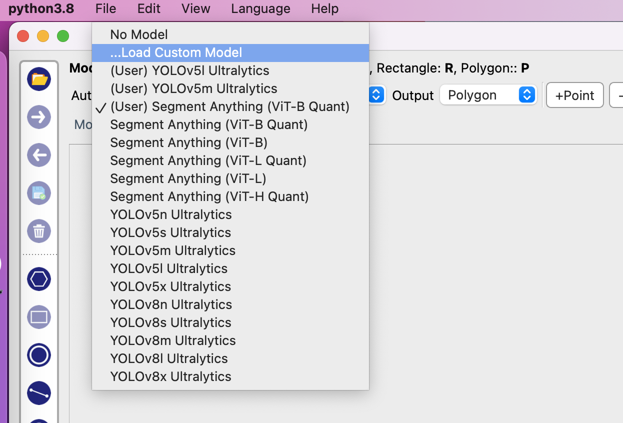 2023년 5월 시점에서 AnyLabeling은 SAM과 YOLOv5, YOLOv8 알고리즘을 제공하고 있으며, 자신이 원하는 모델을 추가하여 자동 Labeling 작업을 수행할 수 있습니다.