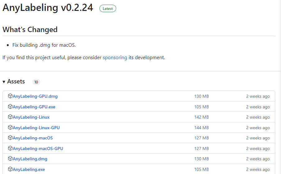 AnyLabeling은 모든 종류의 운영체제(Windows, Linux, MacOS)에서 사용하실 수 있습니다. AnyLabeling Github 사이트에서 아래의 주소를 통해 자신의 운영체제에 맞는 최신 버전을 설치하여 사용하시기 바랍니다.
