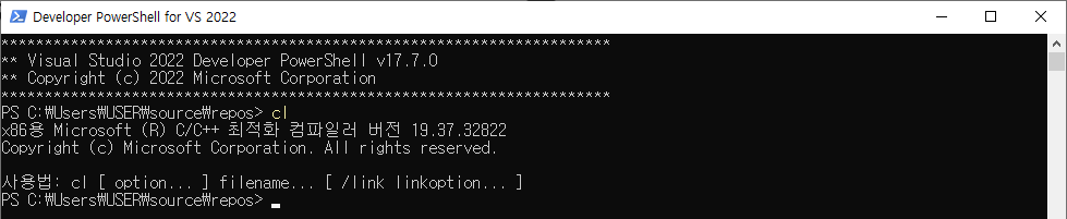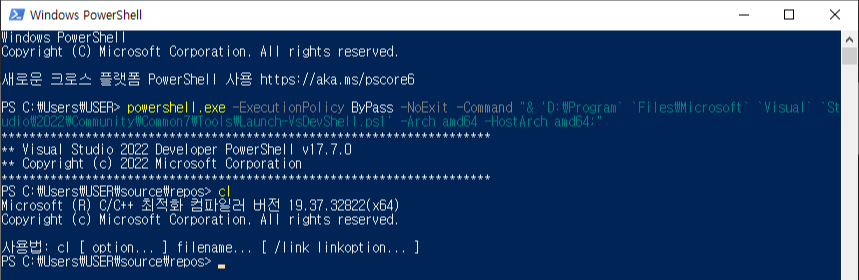 자신의 컴퓨터 환경에 맞추어 Visual Studio에서 제공하는 'Launch-VsDevShell.ps1'을 실행하면서 64비트의 환경을 설정해주면 PowerShell에서도 64비트 환경의 프로그램 수행을 하실 수 있습니다.