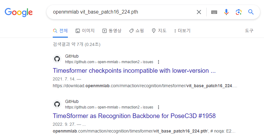 이 문제를 근본적으로 해결할 수 있는 방법은 해당 Pretrained 모델을 다운로드 받아 사용하는 것인데 mmsegmentation 공식 사이트에서는 해당 내용을 찾기가 어려웠습니다. 혹시나 싶어 구글에 'openmmlab vit_base_patch16_224.pth'와 같이 mmsegmenatation에 국한하지 않고 openmmlab 전체에서 해당 사전학습 모델을 찾을 수 있는지 검색해 보았습니다.