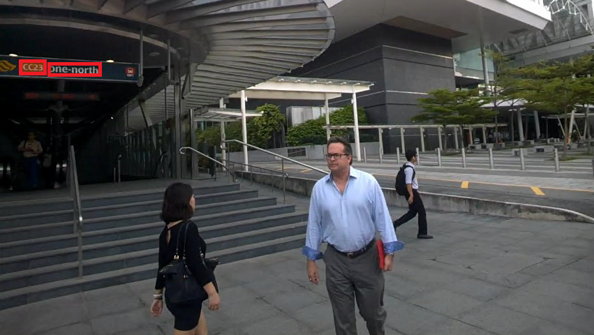 우리들의 눈으로 보았을 때, 위의 이미지에서 Text 정보로는 전철역 출입구 위에 적혀있는 'CC23', 'one-north'을 확인할 수 있습니다. OCR 모델의 출력은 사람이 글씨를 찾아내는 것과 같이 해당 글자 부분을 Object Detection처럼 표시해줄 것입니다.
