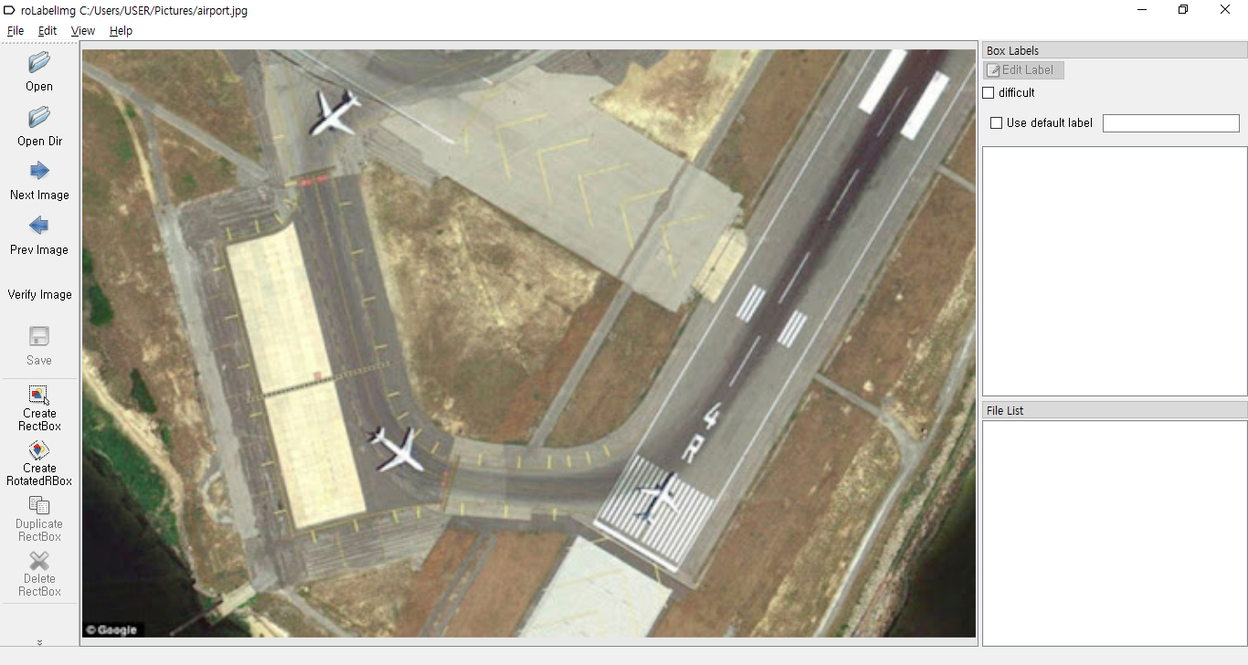 위 과정대로 진행하셨다면 roLabelImg 프로그램이 실행되는 것을 확인하실 수 있습니다. 자신이 Label을 하고자 하는 이미지룰 불러봅니다.
