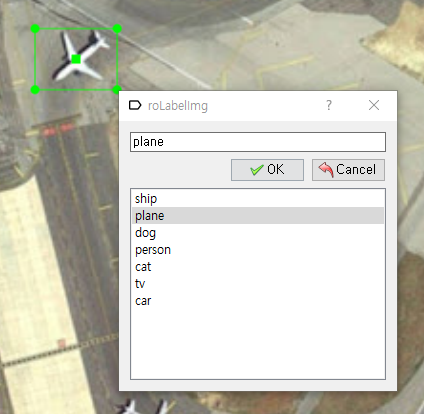 위성으로 찍은 공항 사진에서 비행기가 향하는 방향대로 Label을 진행해보겠습니다. 'Create Rotated RBox'를 클릭하여 아래와 같이 비행기를 전체적으로 Bounding합니다.