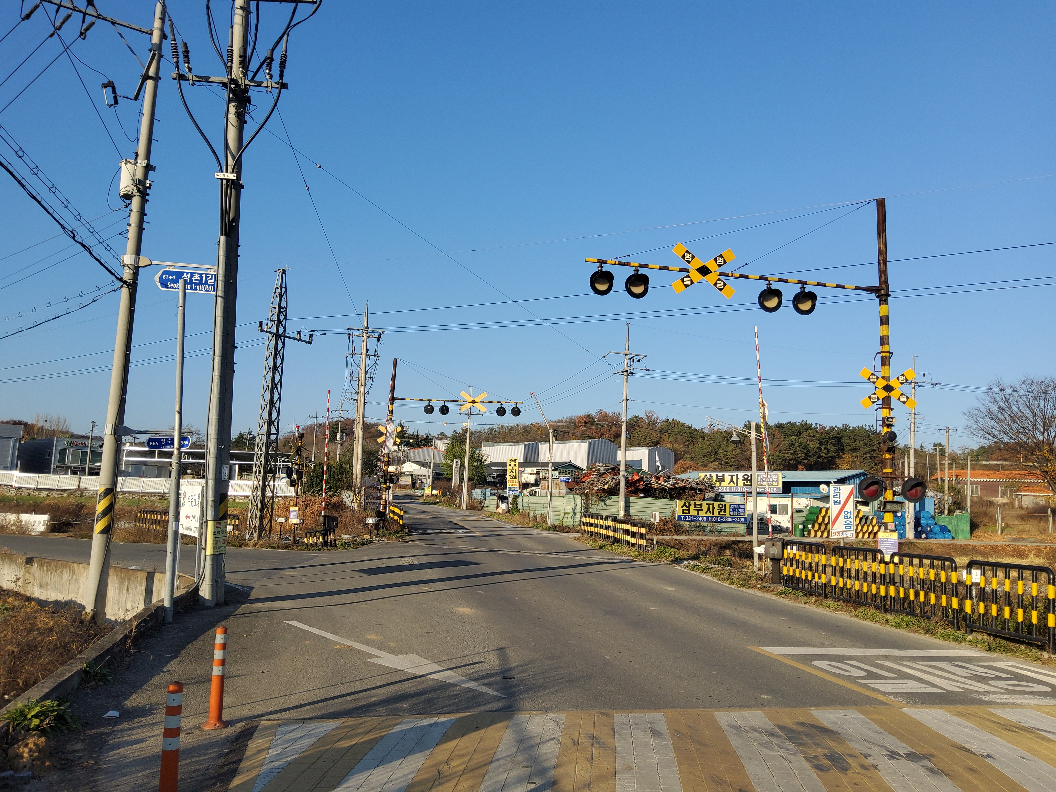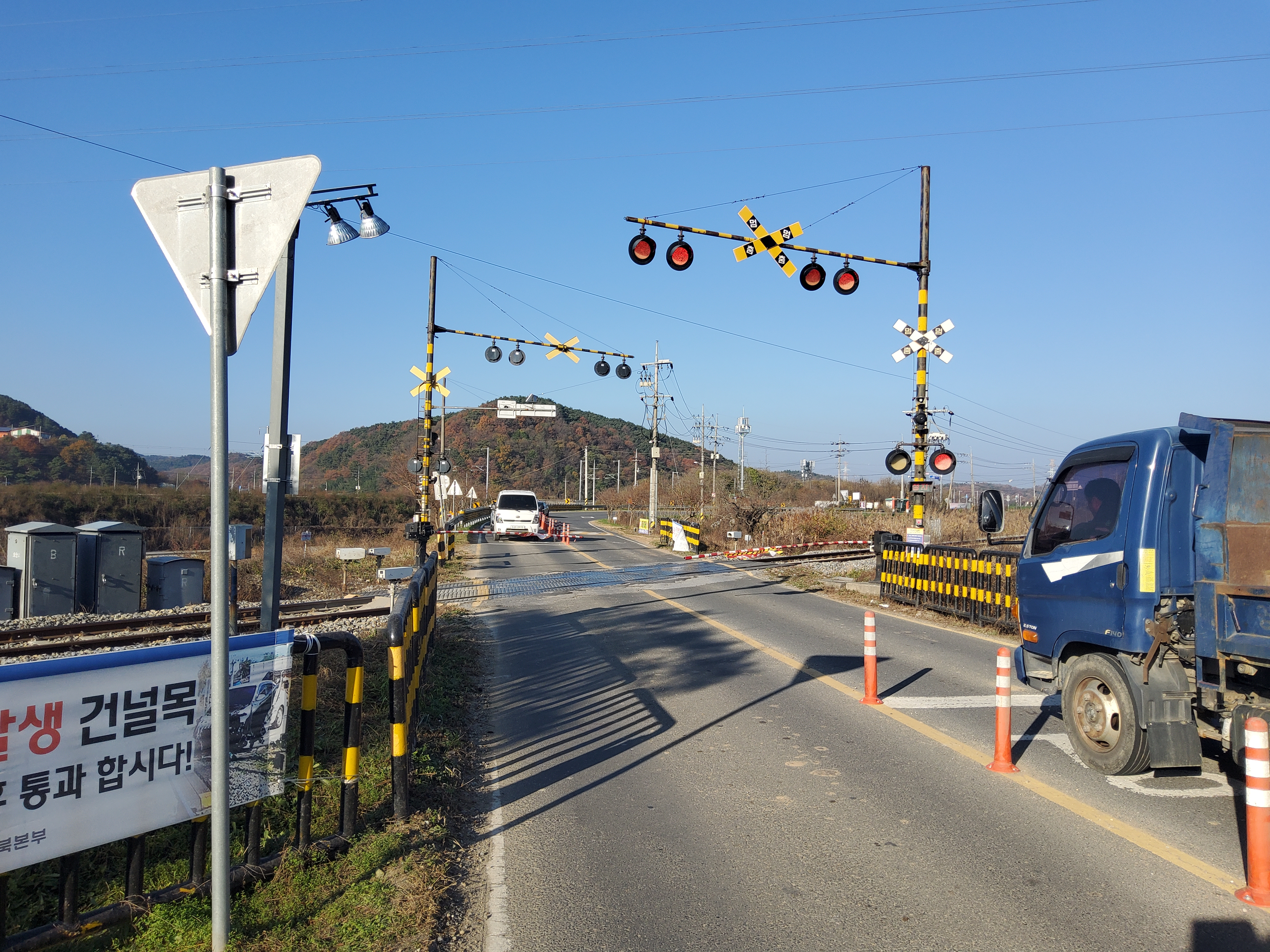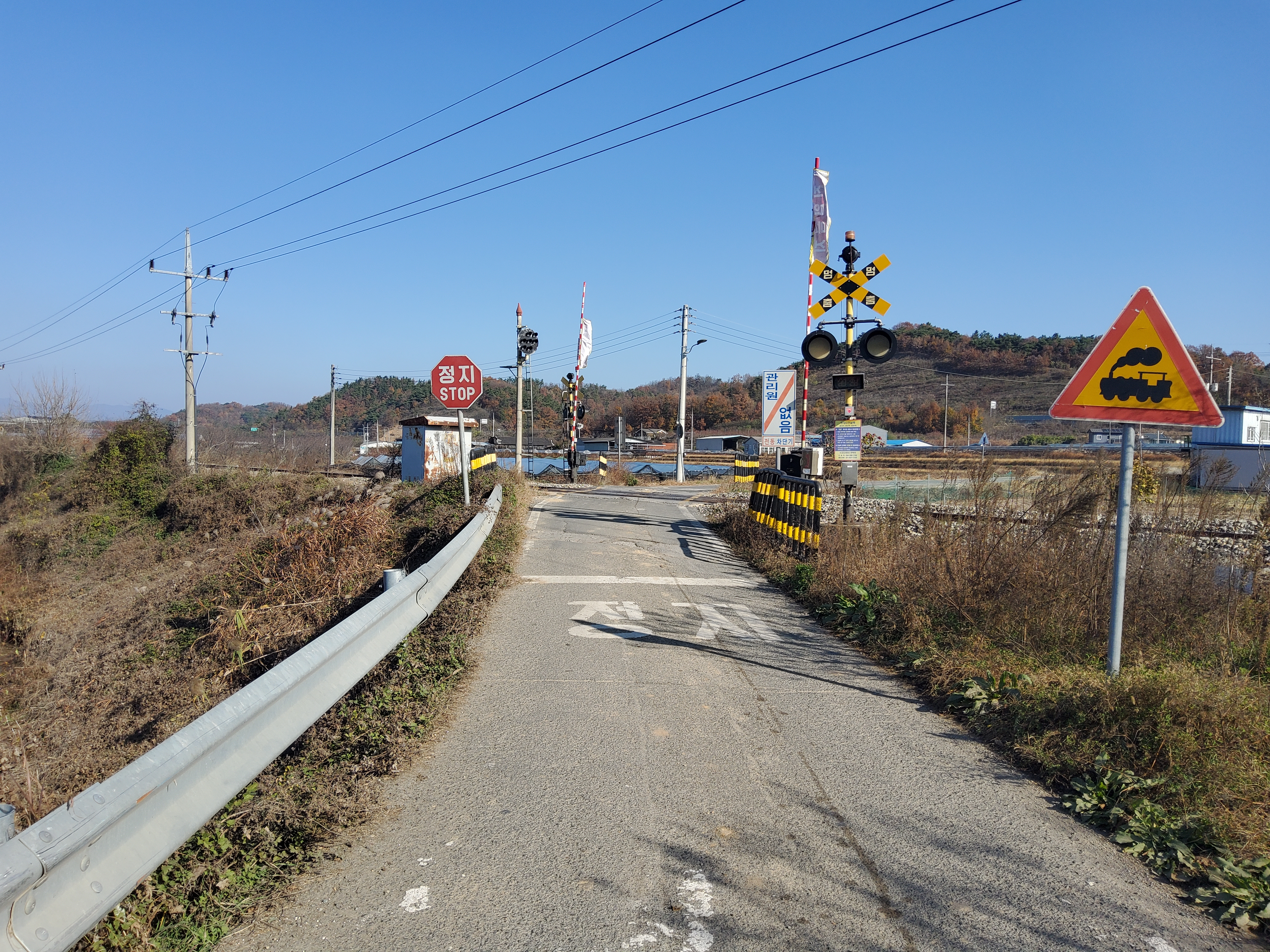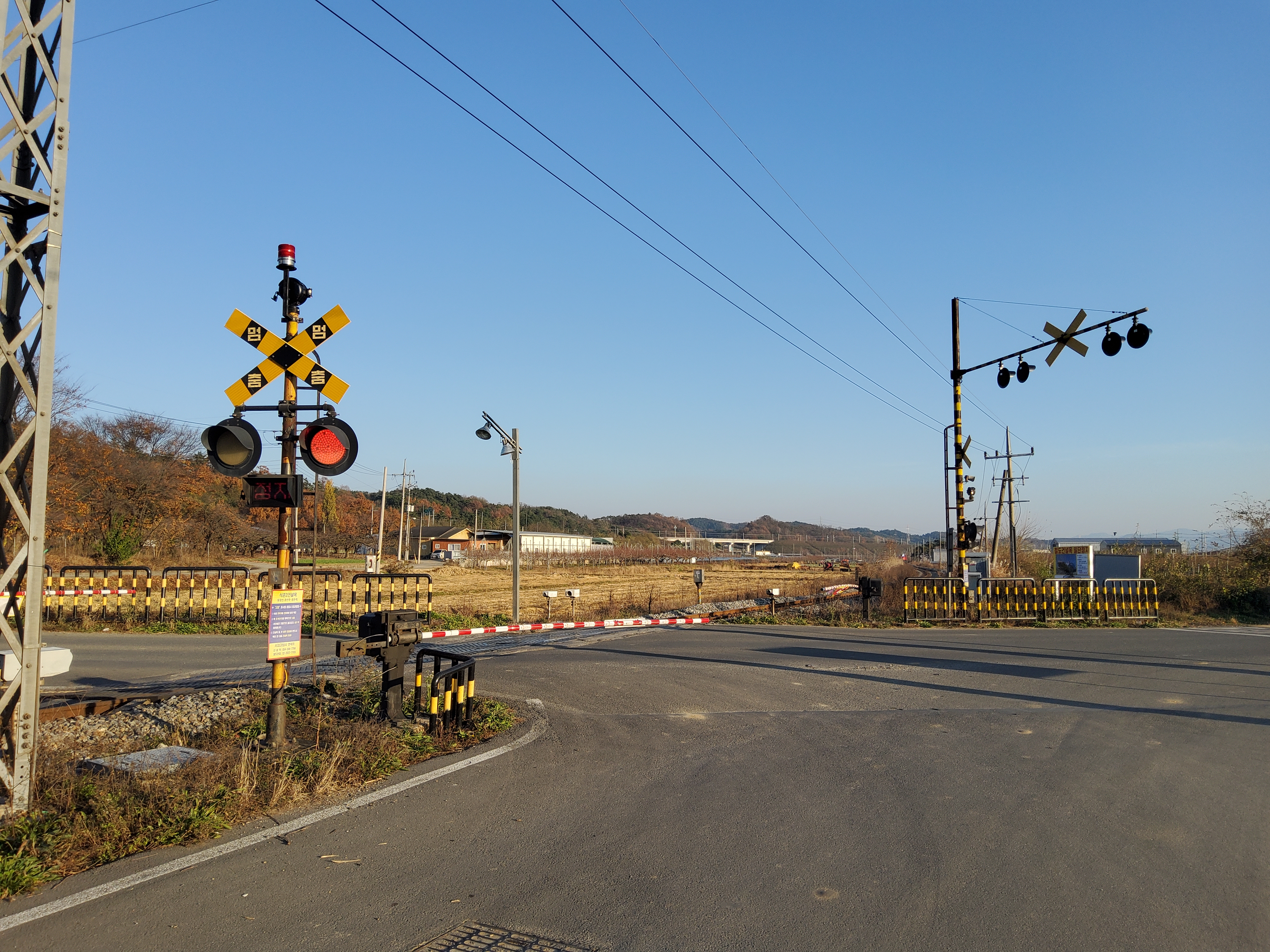 왕복 4차선 도로가 이 건널목에서만 2차선으로 줄어듭니다. 아마도 선로이설 후 추가 공사를 하겠죠