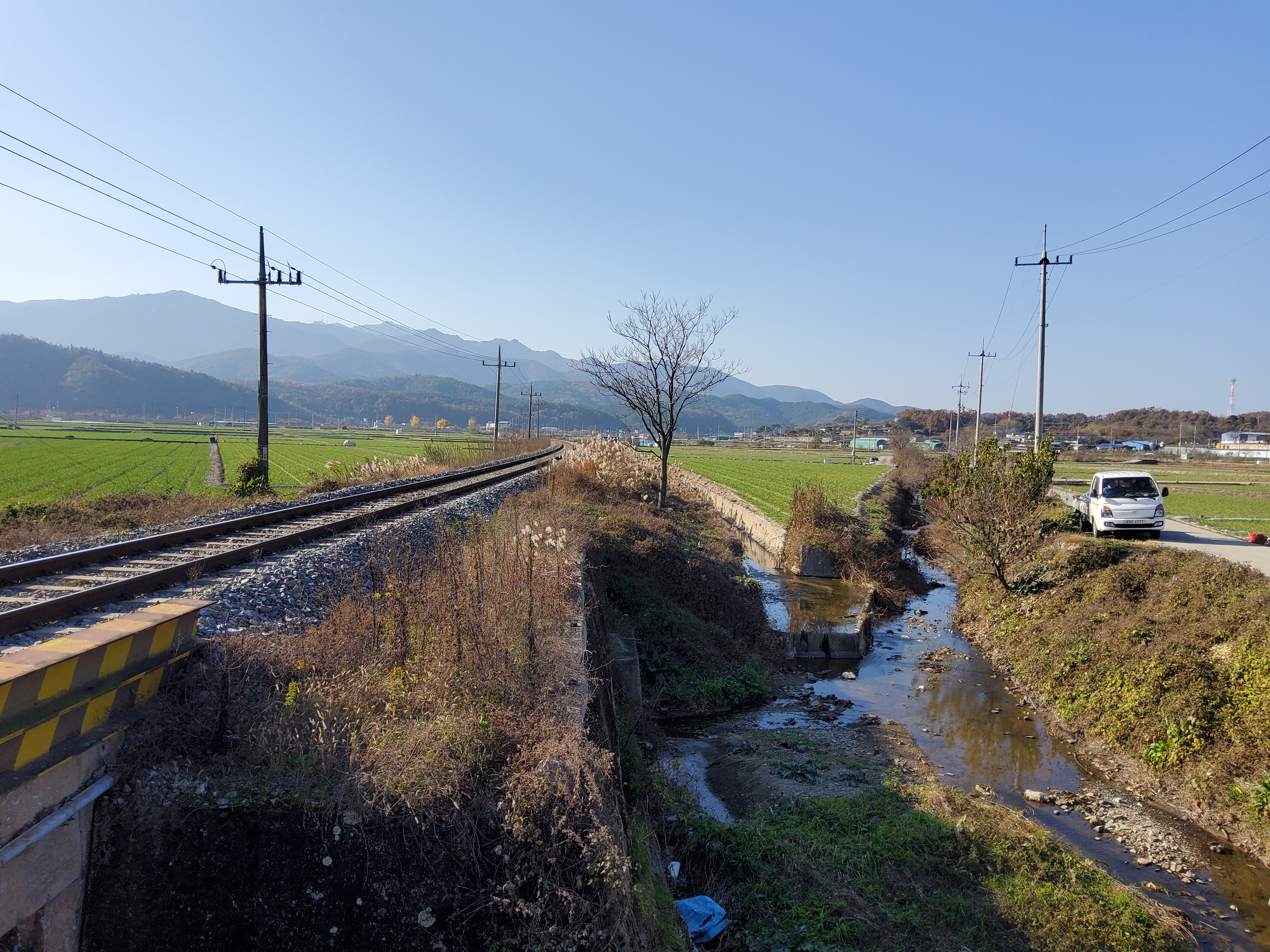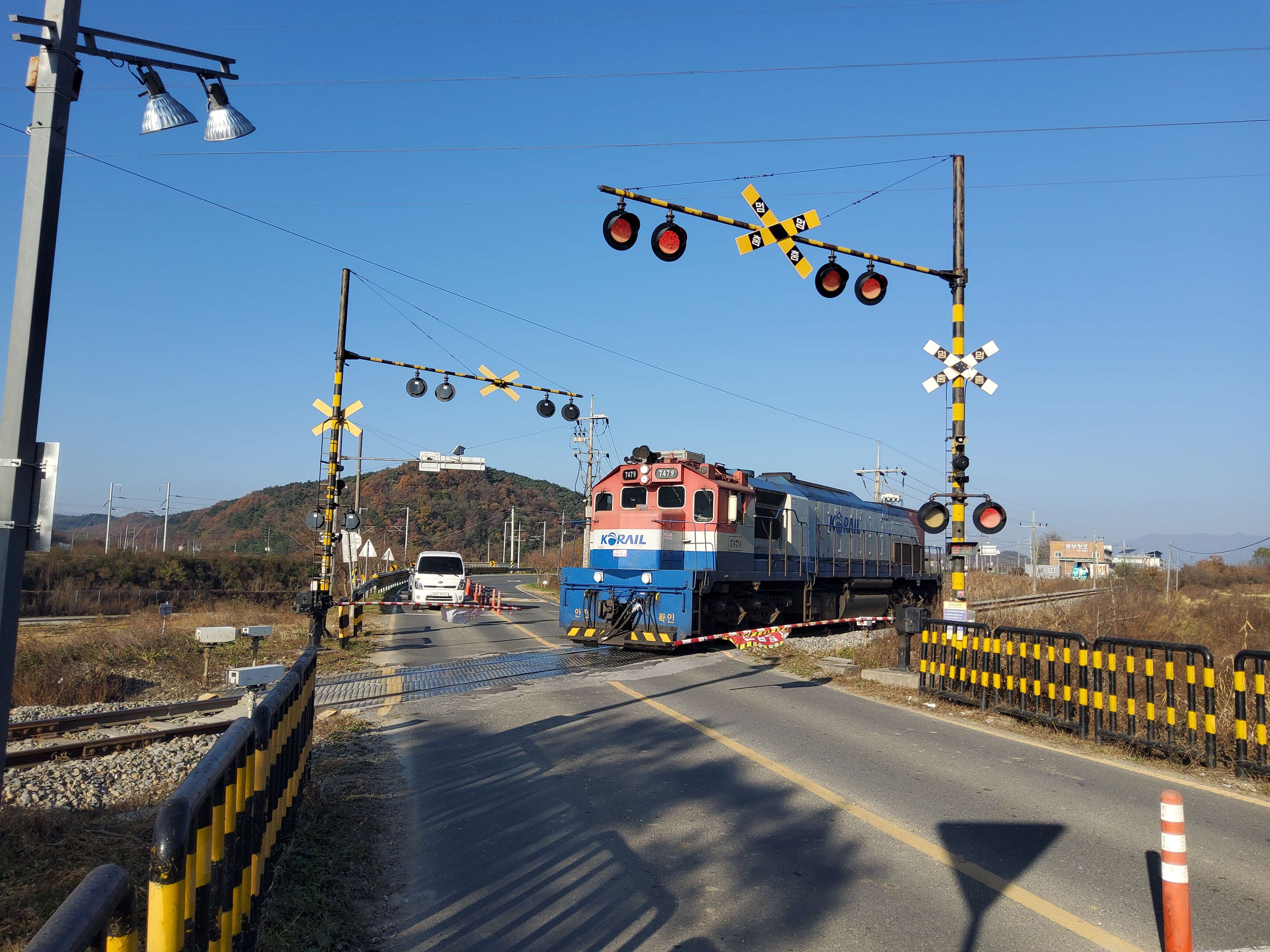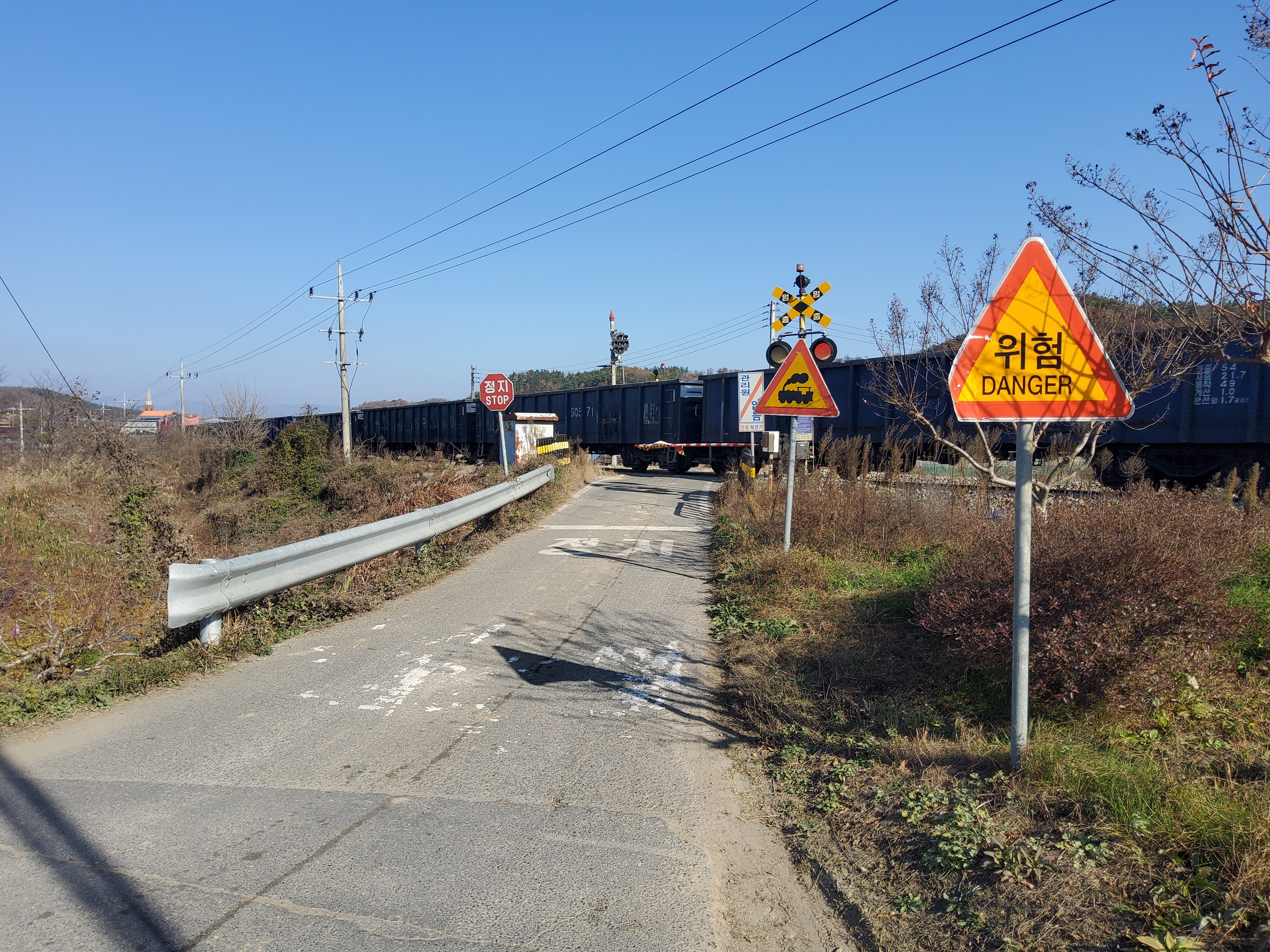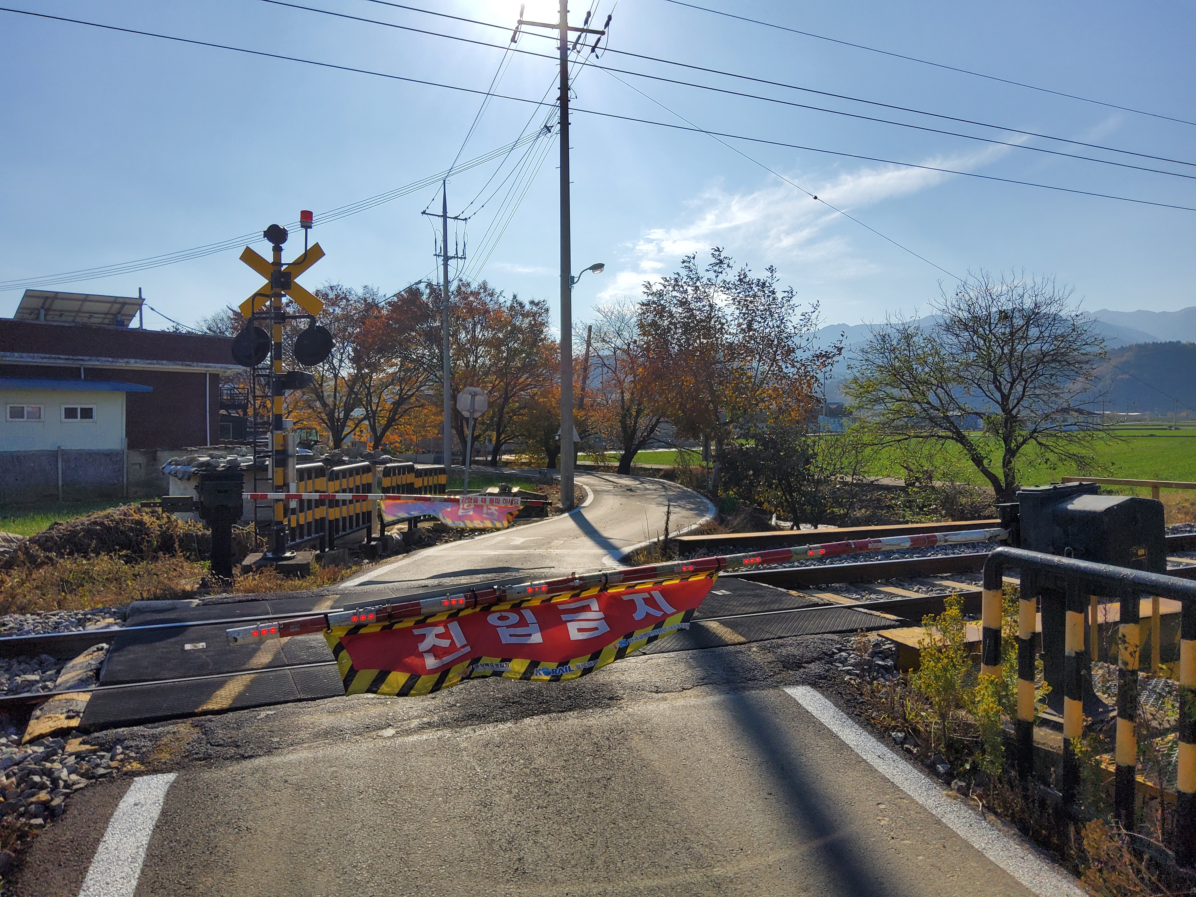 왕복 4차선 도로가 이 건널목에서만 2차선으로 줄어듭니다. 아마도 선로이설 후 추가 공사를 하겠죠