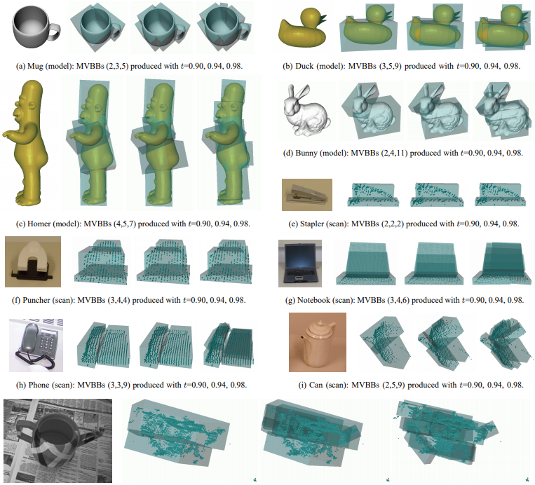 머그컵, 오리 인형, 전화기 등이 박스들로 쪼개지는 과정입니다. 처음에는 박스 1개였다가 설정값을 조절함에 따라 박스가 늘어나며 물체의 실루엣을 닮아갑니다. 지저분한 실제 카메라 데이터(가장 아래 이미지)에서도 꽤 정확하게 형태를 잡아내는 것을 볼 수 있습니다.