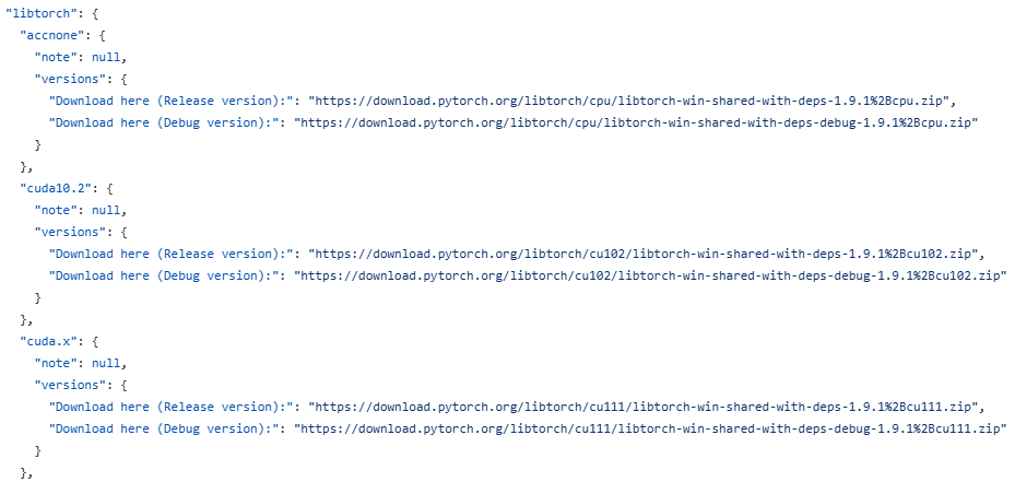 위 페이지에서 json 양식으로 작성된 파일 내에서 자신이 원하는 Libtorch의 버전을 찾으실 수 있습니다.