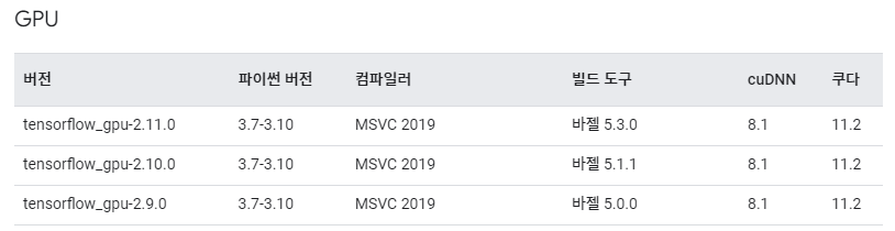 TensorFlow 2.10을 기준으로 cuda 11.2 버전과 cudnn 8.1 버전이 호환됨을 확인할 수 있습니다. 자신이 설치하는 TensorFlow의 호환 버전에 맞추어 cuda와 cudnn 및 msvc를 설치해줍니다.